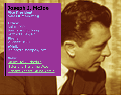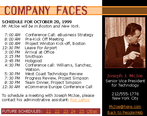Title: Type of Project: Project Purpose: Design Discussion: The second design is more like a page from the rolodex, but with the unique advantages of the web built in. The deliberate pixellation of the image behind it and the almost-jarring contrast color is suitable for a page that is likely to be viewed once in a rare while. Rejection Rationale: The challenger did say that they preferred the hipness of the second design, but the utility of the first. |